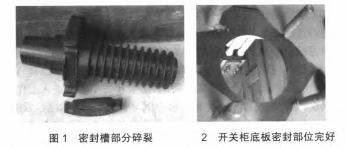 10kV充氣柜作業(yè)一段時間后,低氣壓報警主張,斷路器氣室壓力下降,經(jīng)SF氣體檢漏儀檢測為穿墻套管部分漏氣,拆開穿墻套管后發(fā)現(xiàn)密封槽部分碎裂,如圖1所示,開關柜底板密封部位完好,如圖2所示。