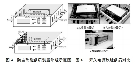 3.2在設(shè)備本體進(jìn)風(fēng)孔加防塵網(wǎng),避免塵土進(jìn)入設(shè)備內(nèi)部,設(shè)備維護(hù)人員定時(shí)對(duì)濾網(wǎng)間斷清掃,然后減輕元器件外表覆塵,利于設(shè)備正常散熱,如圖3所示加裝防塵網(wǎng)后開(kāi)關(guān)電源標(biāo)明圖。對(duì)設(shè)備施行上述改善后,其改善前后對(duì)比如圖4所示。
