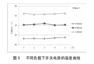 改善后,為考證改善作用,對(duì)開(kāi)關(guān)電源分別在0.5倍、0.8倍及1.0倍負(fù)載下間斷了為期5天的帶負(fù)荷實(shí)驗(yàn),圖5為不同負(fù)載下開(kāi)關(guān)電源的溫度曲線,由圖5可知,跟著負(fù)荷的增大,開(kāi)關(guān)電源問(wèn)題整體呈上升趨向;負(fù)載不變的情況下,同一溫度曲線根柢堅(jiān)持滑潤(rùn);開(kāi)關(guān)電源在額定負(fù)載下作業(yè),最高溫度不超越57℃,未達(dá)報(bào)警值,開(kāi)關(guān)電源穩(wěn)定性得到明顯前進(jìn)。